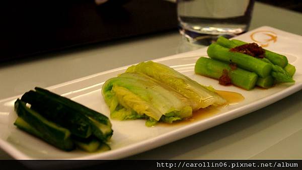 青菜一小碟,小黃瓜、娃娃菜、蘆筍三種菜,我只有吃娃娃菜,吃起來有一點鮑魚湯汁的味道,不過似乎每種的調味方式是有些不同(看起來就不同)。