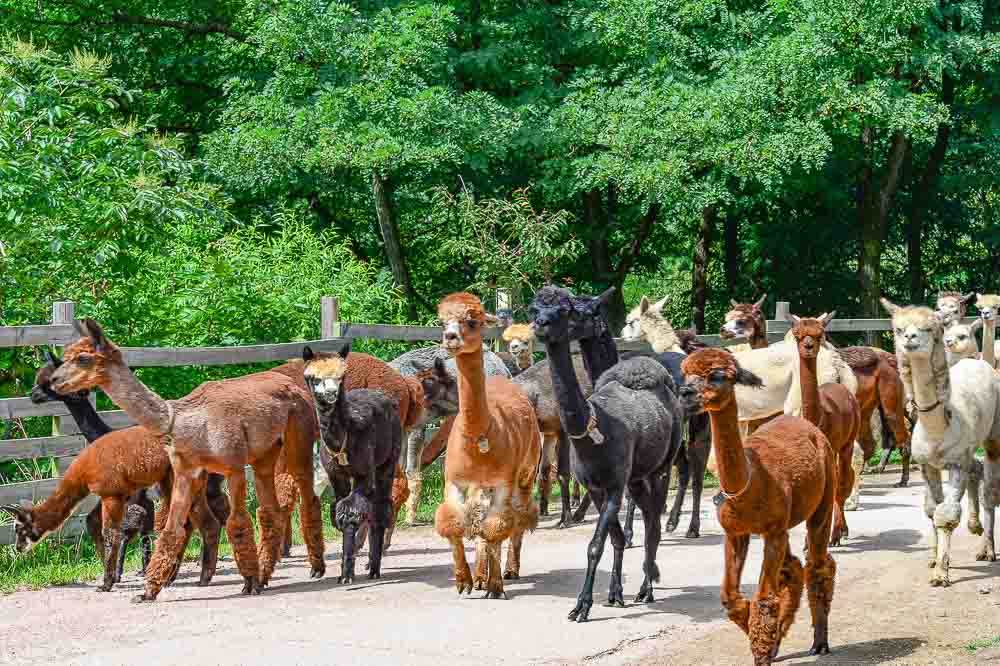 時間一到,羊駝們就被園方放出來,牠們會從山坡上一路往下狂奔,一大群草泥馬衝到大家身邊討食物吃。