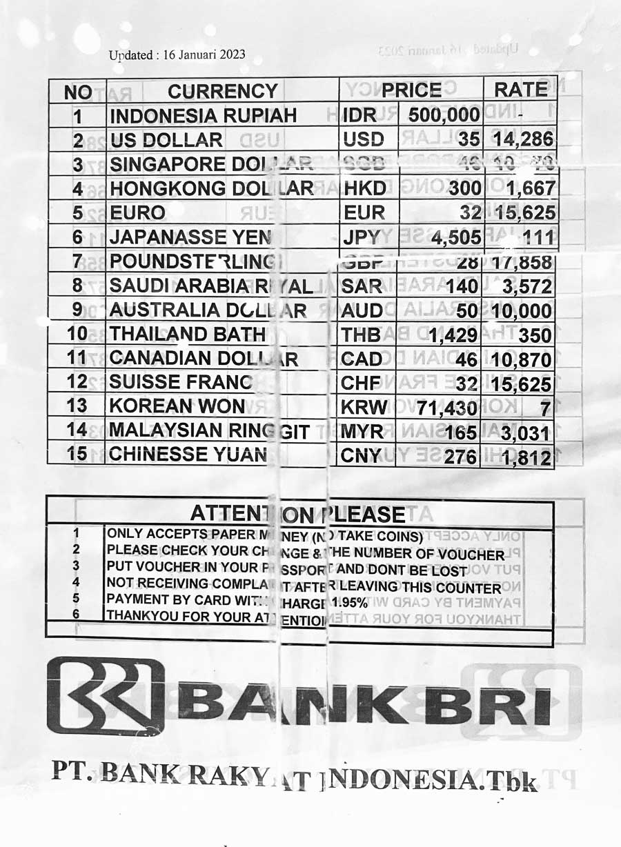 所以建議直接以印尼盾付落地簽費用,也可以使用信用卡刷卡,但是辦理落地簽刷卡會收取 1.95%手續費(如果還沒換錢也只能刷卡了,別擔心一出機場就一堆換錢的)。