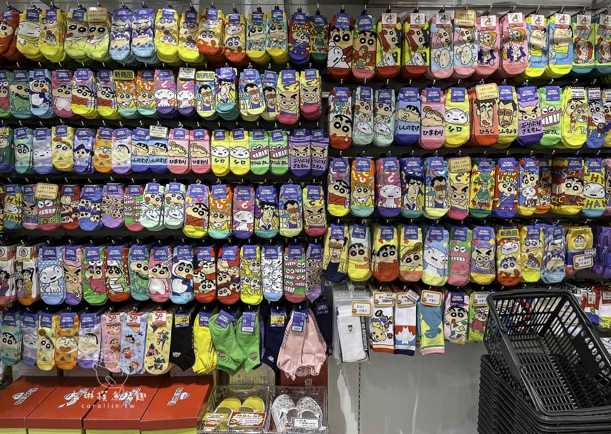 蠟筆小新主題專賣店空間不大,但賣的商品數量是真的也不少,尤其各種陪伴日常生活的用品齊全,看看光蠟筆小新的襪子就有這麼多~