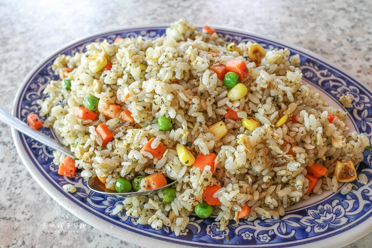 100元份量也很足的茶葉炒飯,摻在炒飯中的茶葉肉眼輕易可見,最大缺點應該是…有很多人討厭的三色豆吧?