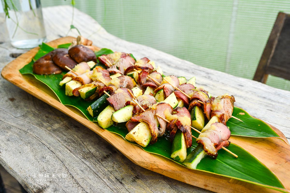 煙燻豬肉是《Fudin Cafe 浮定咖啡》自家煙燻的,和擳瓜串在一起,搭配微微辛辣的調味,暨濃厚又爽口,卡琳我滿喜歡這道,尤其切得超大塊的擳瓜口感特別好。