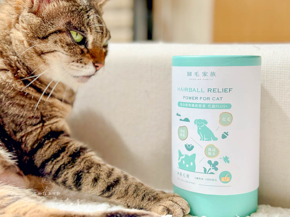 歸毛家族排毛寶加入洋車前子殼粉,可以溫和吸附排出腸道毛髮,並加入綠茶和綠藻萃取,降低糞便氣味。