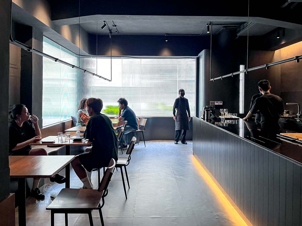 HUGH dessert dining 這間在大同區巷弄間的低調甜點店,內部用餐空間是很純粹的黑色,並使用凹凸紋理的霧面玻璃,將室外光線柔和引入。