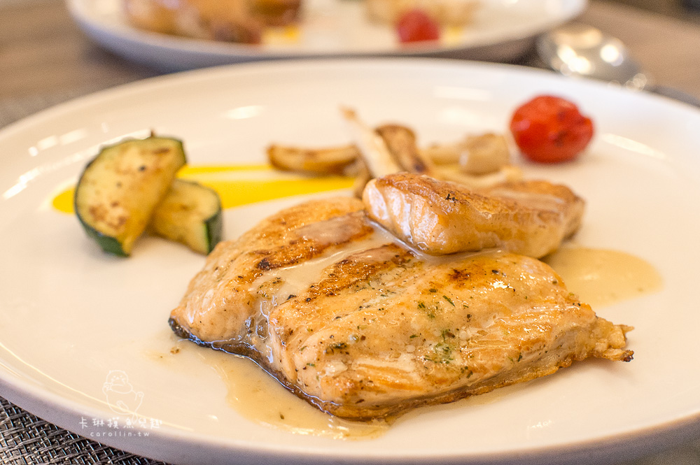 鮭魚排的調味和雞腿肉不同,很有在磚吃排餐的西餐廳吃魚排的感覺,鮭魚肉也煎得剛剛好,確實相當厲害。