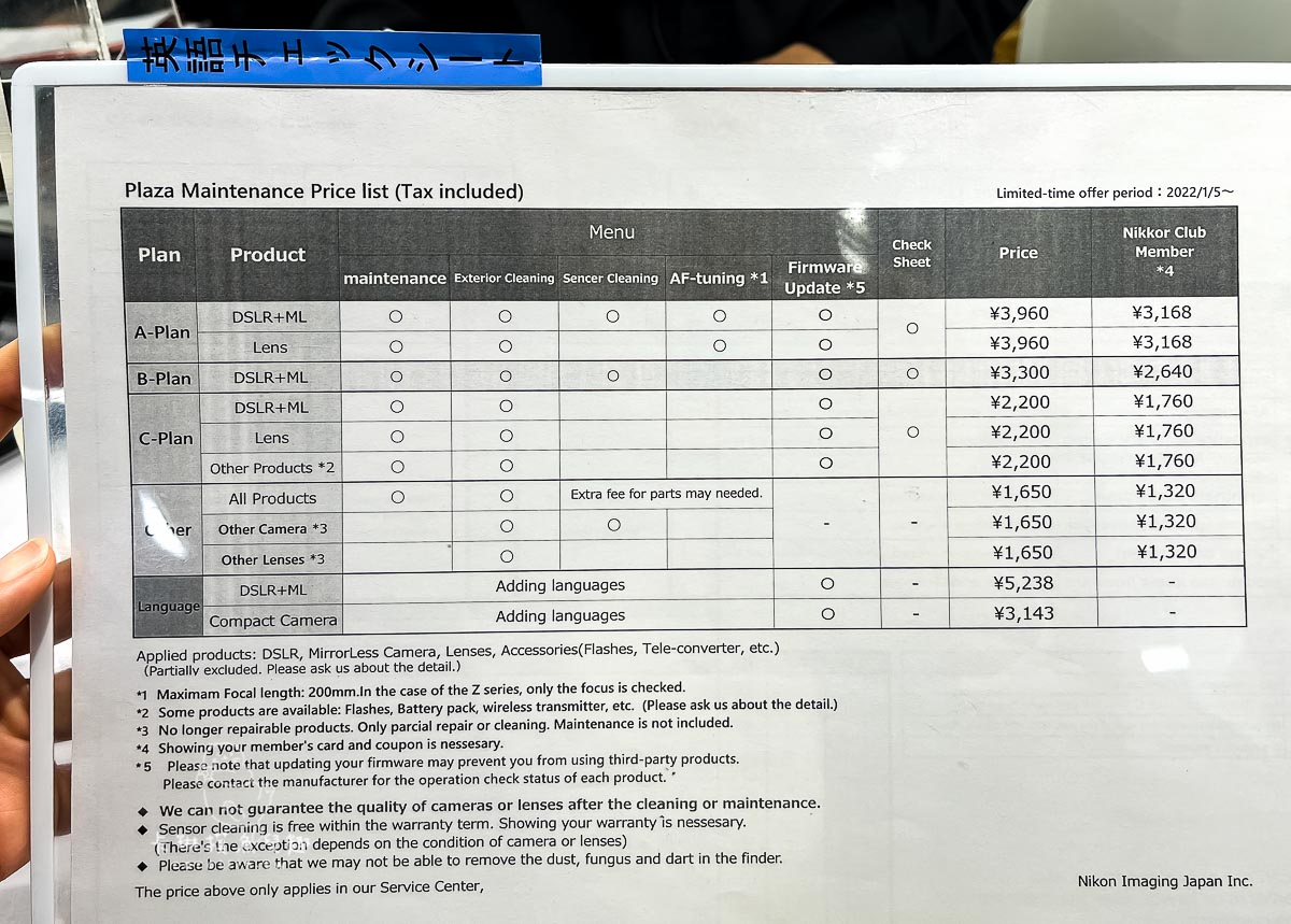 直接把 Nikon Plaza Tokyo 檢測的收費價目表拍給大家看~