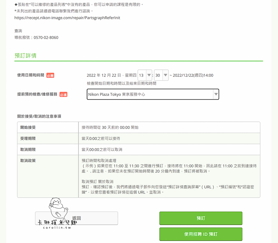 因為 Nikon Plaza Tokyo 是完全預約制,沒預約就直接帶著相機鏡頭等設備前往會被拒絕受理,記得要填單線上預約喲!