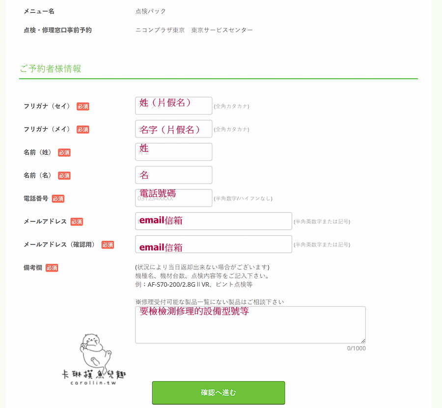 預約資料的表單,如果用 Google 網頁自動翻譯,會變得有點奇怪,其實還是不容易看懂,這邊幫大家標記了一下該填什麼。