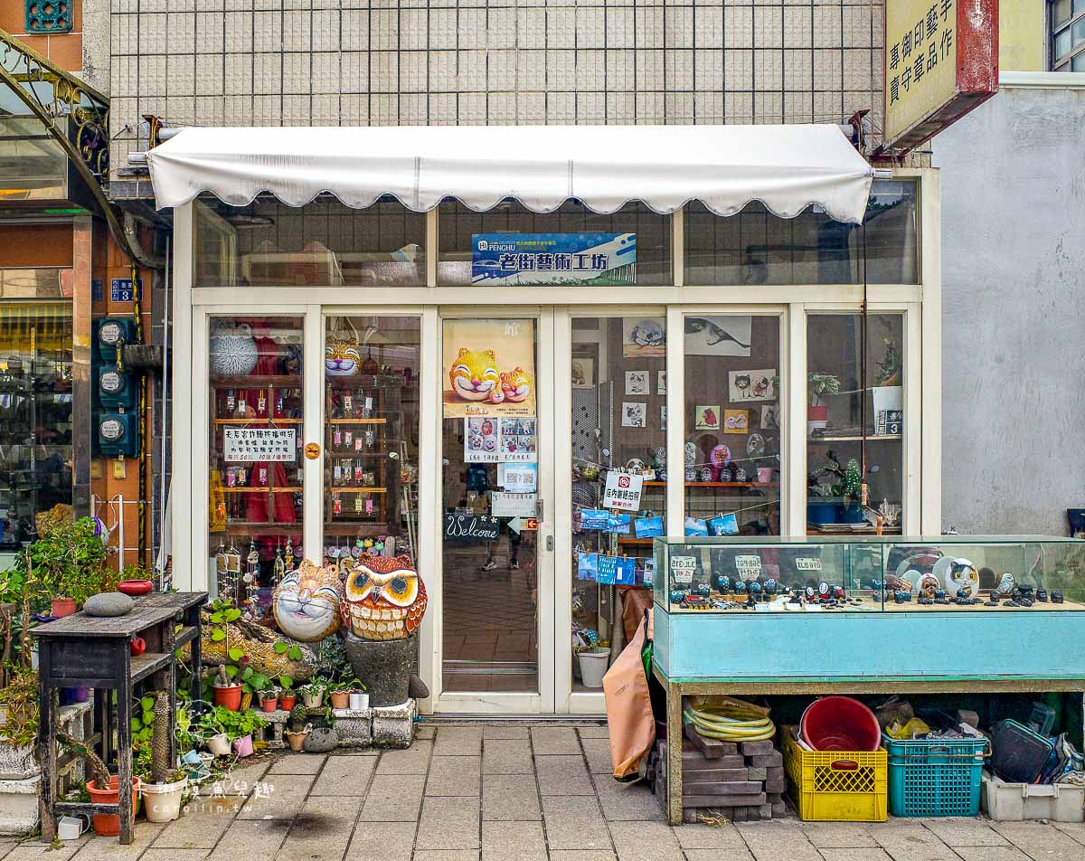 如果想帶可愛的澎湖紀念品回家,推薦可以來這間「老街藝術工坊」逛逛,店內有許多各式各樣的造型玄武岩印章、雕刻藝術品和浮球彩繪等紀念品,都是老闆自己做的喲!