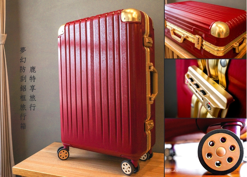 鋁框行李箱或是防刮拉絲紋的行李箱都看過不少,兩種二合一的也不算少,但造型還做的很復古味的就不多了,鹿特夢幻防刮鋁框旅行箱有出好幾款顏色,我特別喜歡深紅金就是為了這雙色搭配,不只醒目好看,配了金邊還有更有奢華復古感了。