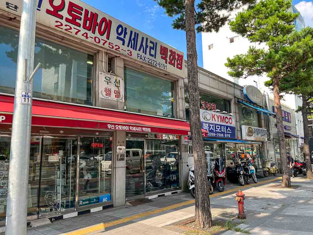 這張照片是回頭拍的,從地鐵站忠武路8號出口出來,機車行會在左手邊現身