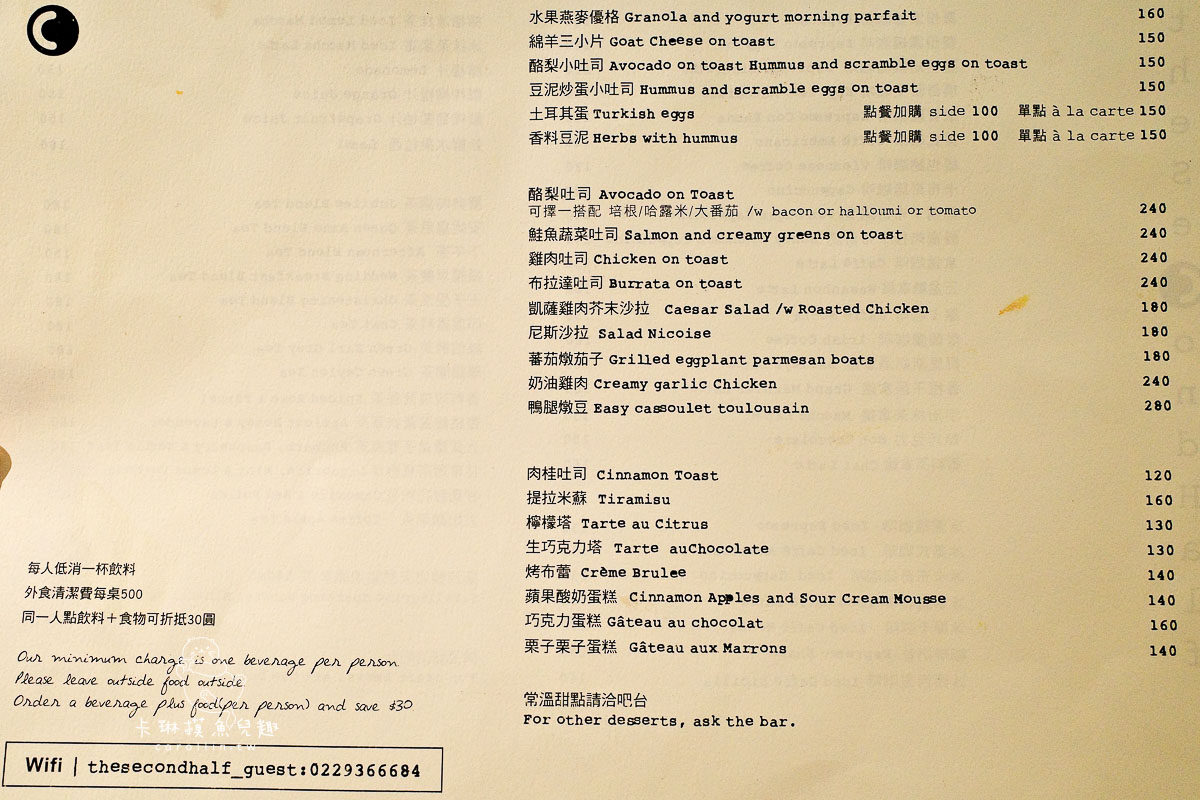 《The Second Half Cafe》餐點以輕食和咖啡飲品為主,早午餐輕食中又以酪梨吐司、鮭魚土司等幾款吐司最受政大學生和附近文山在地人喜愛,價位不低,但我看網路評價說《The Second Half Cafe》的輕食餐點分量不少。
