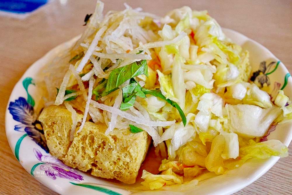 玉里橋頭臭豆腐是在酥酥脆脆的臭豆腐上,放上蘿蔔絲、和泡菜,醬汁的味道也和平時吃到的不太一樣。